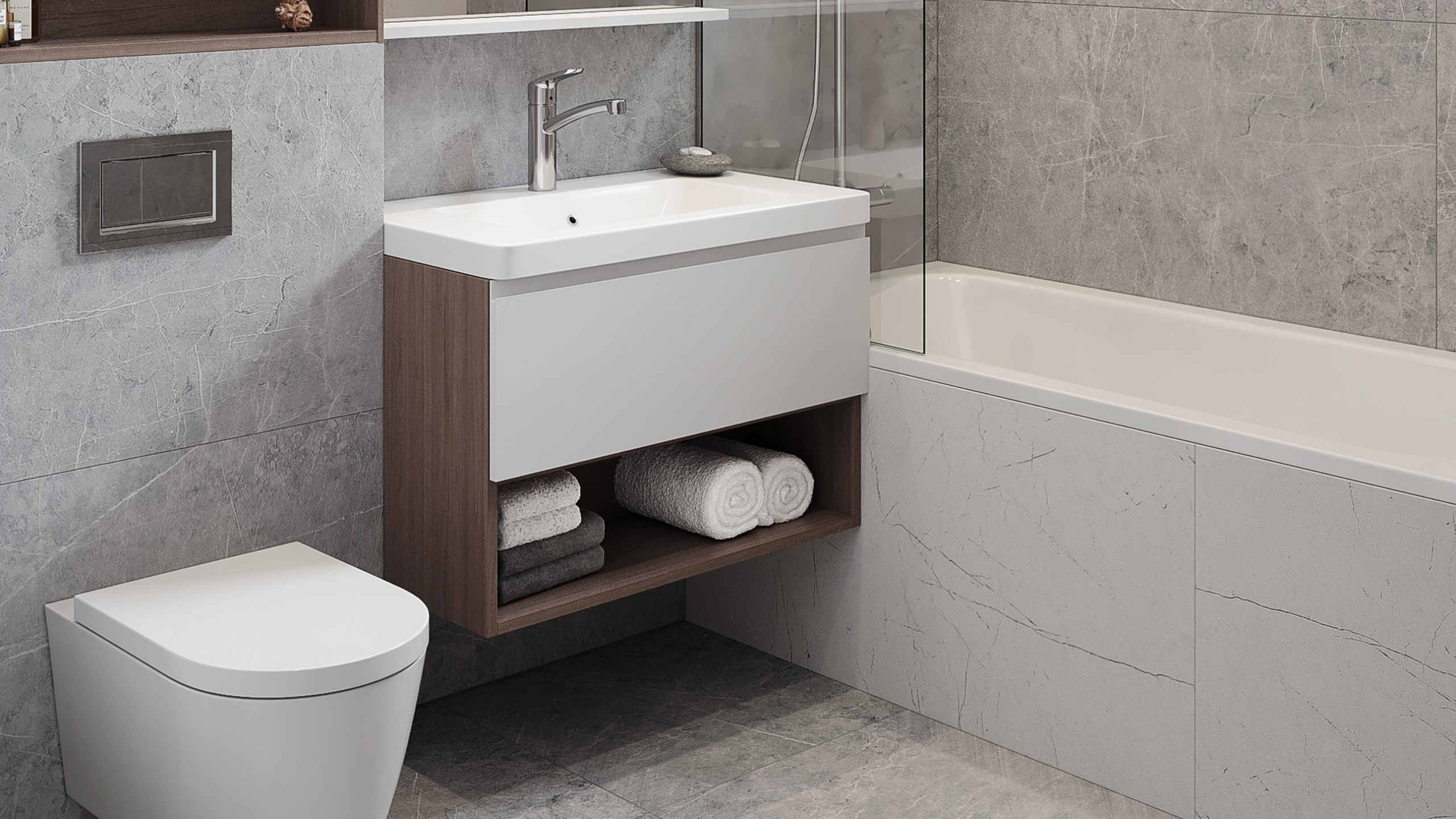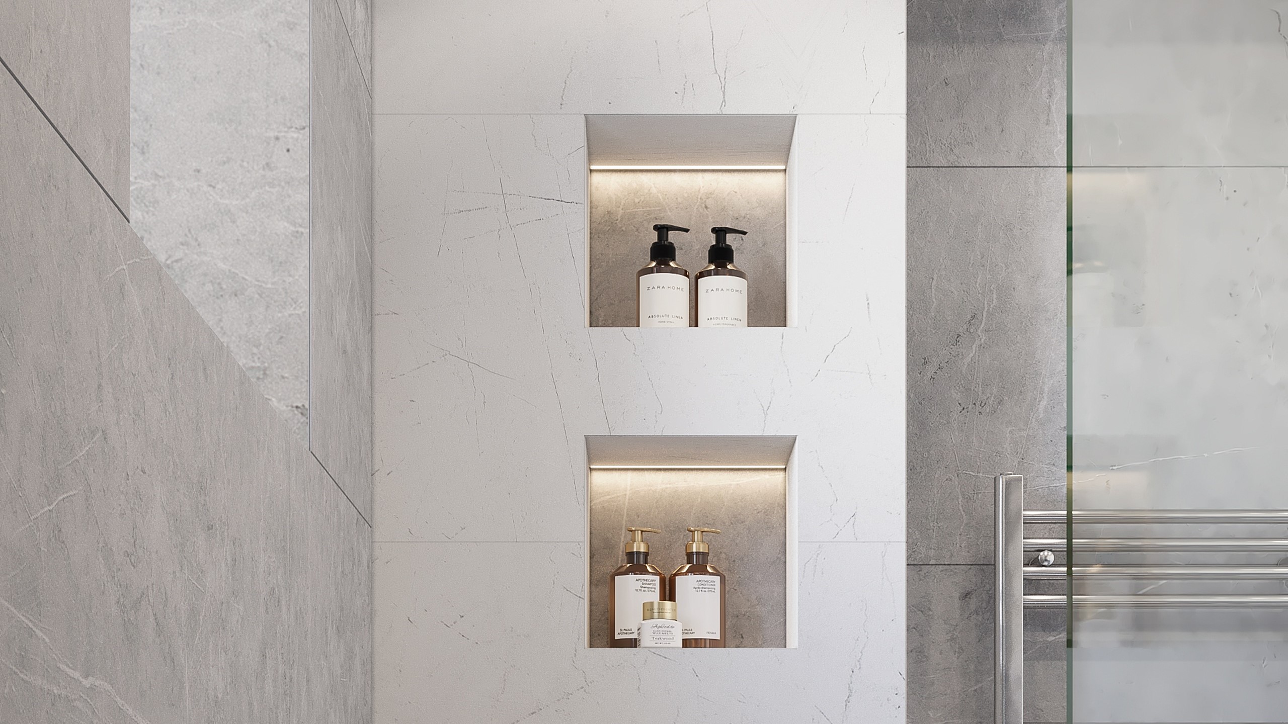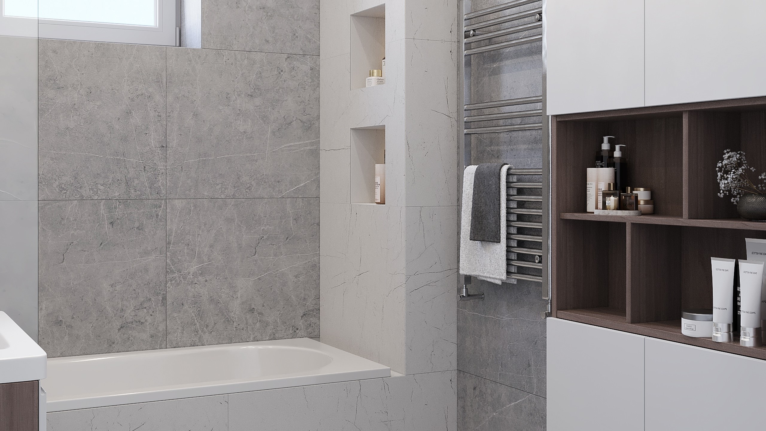 Гармония минимализма и тепла — именно так можно охарактеризовать этот проект ванной комнаты от Вячеслава Борисова. Интерьер выстроен на тонком балансе между строгой геометрией, сдержанной цветовой палитрой и ощущением уюта, которое возникает благодаря продуманным материалам и деталям. Ключевую роль в пространстве играет керамогранит Marmulla с выразительной текстурой мрамора. Его благородный серый оттенок с мягкими природными прожилками формирует спокойный и элегантный фон, визуально объединяя стены, зону ванны и душа. Текстура выглядит естественно и глубоко, добавляя интерьеру статусность без излишней декоративности.